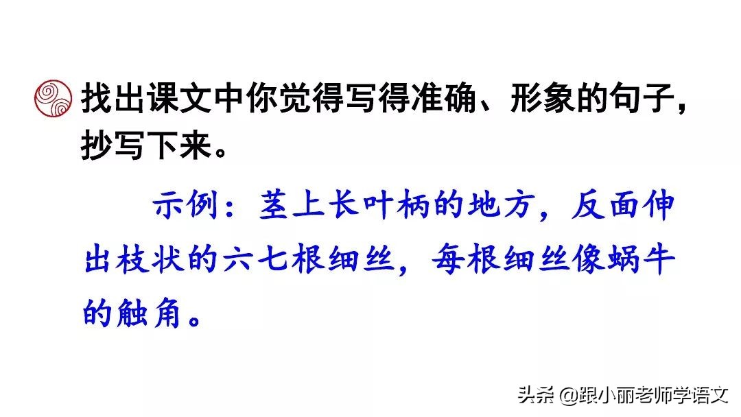 3.(1)那些葉子綠得那么新鮮,看著非常舒服。葉尖一順兒朝下,在墻上鋪得那么均勻,沒有重疊起來的,也不留一點兒空隙。一陣風拂過,一墻的葉子就漾起波紋,好看得很。(2)莖上長葉柄的地方,反面伸出枝狀的六七根細絲,這些細絲很像蝸牛的觸角。(3)爬山虎的腳觸著墻的時候,六七根細絲的頭上就變成小圓片,巴住墻。細絲原先是直的,現在彎曲了,把爬山虎的嫩莖拉一把,使它緊貼在墻上。