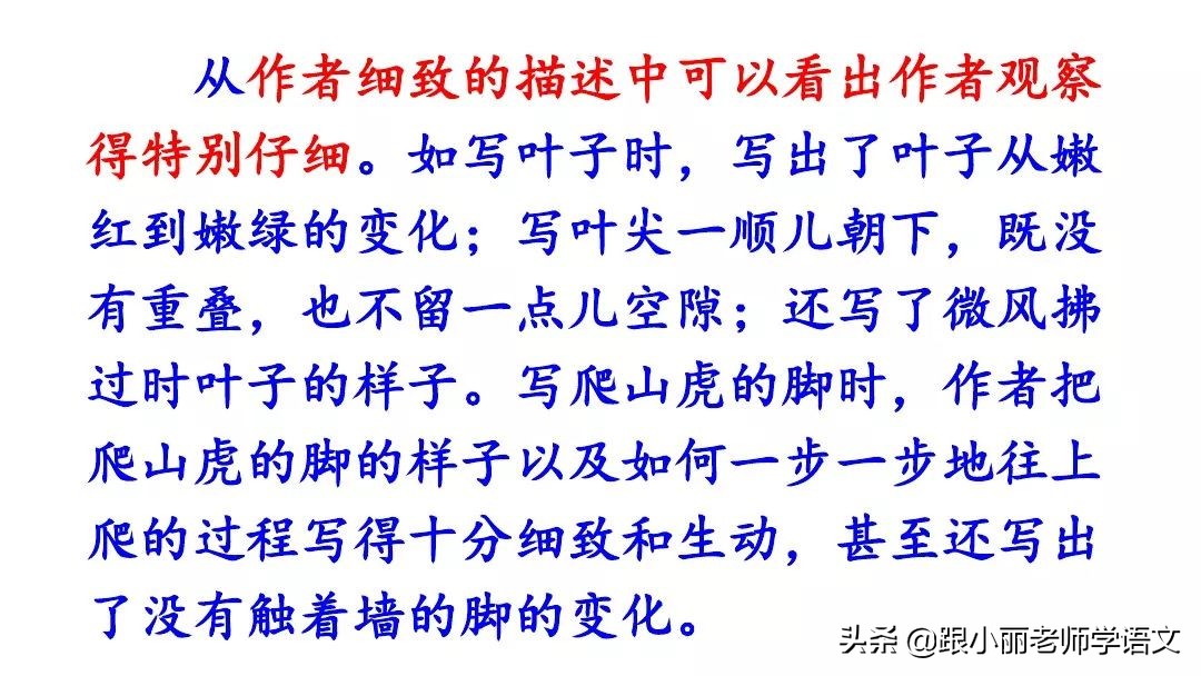 1.從作者對爬山虎葉子的描寫、對爬山虎的腳的生長位置、形狀和顏色的描述及對爬山虎爬墻過程的詳細描寫可以看出作者觀察得特別仔細。