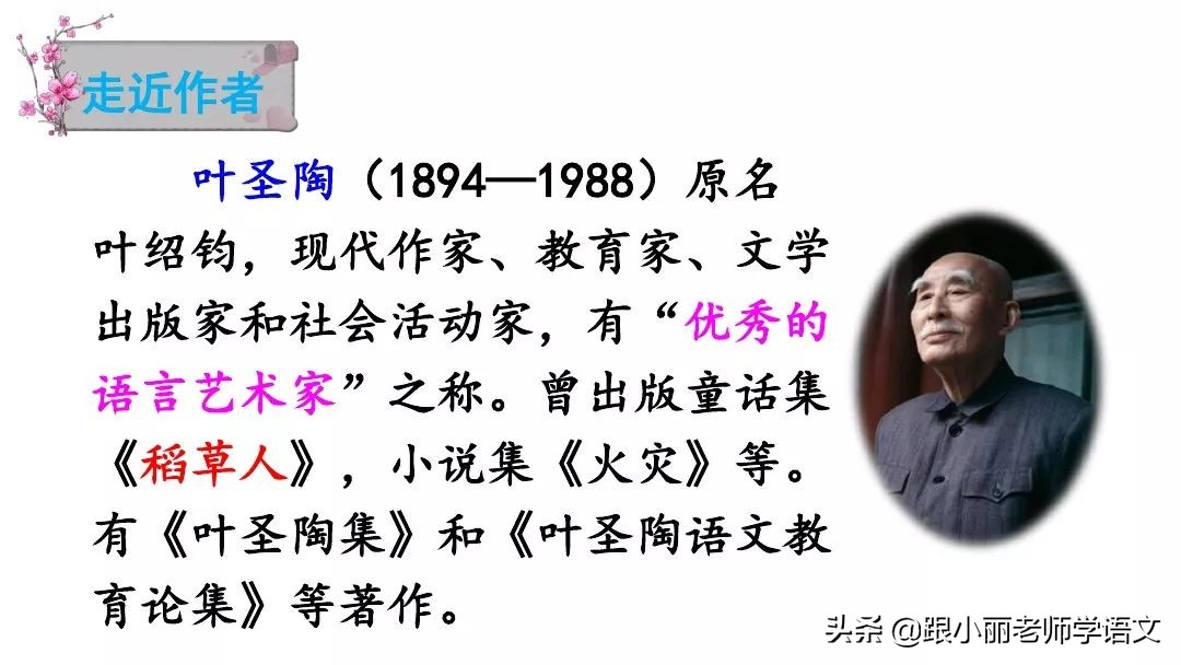 葉圣陶:(1894—1988),原名葉紹鈞,江蘇蘇州人,我國現代著名作家、教育家、出版家,是現代童話創作的重要奠基人。主要作品:童話集《稻草人》、長篇小說《倪煥之》。