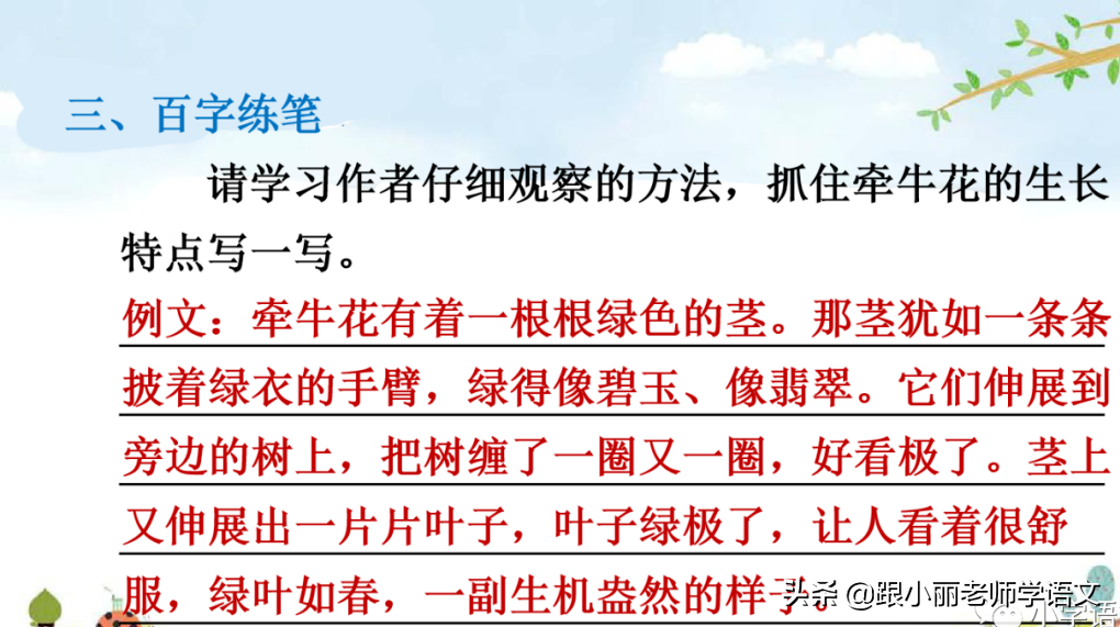 請學習作者仔細觀察的方法,抓住牽牛花的生長特點寫一寫。牽牛花有著一根根青綠色的莖。那莖猶如一條條穿著綠裝的手臂,綠得像碧玉、像翡翠。它們伸展到旁邊的樹上,把樹纏了一圈又一圈,好看極了。莖上又伸展出一片片葉子,葉子綠極了,讓人看著很舒服,綠葉如春,一副生機盎然的樣子;葉子的柄是紅色的,這把牽牛花的綠點綴得更加耀眼奪目了……