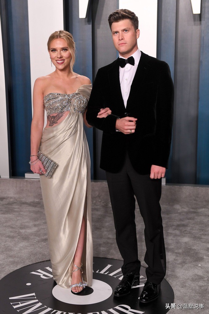 斯嘉麗·約翰遜和科林·約斯特出席2020年2月9日舉行的《名利場》奧斯卡晚會。斯嘉麗穿著一件華麗的金屬連衣裙閃閃發光,而科林穿著一件黑色燕尾服顯得衣冠楚楚。