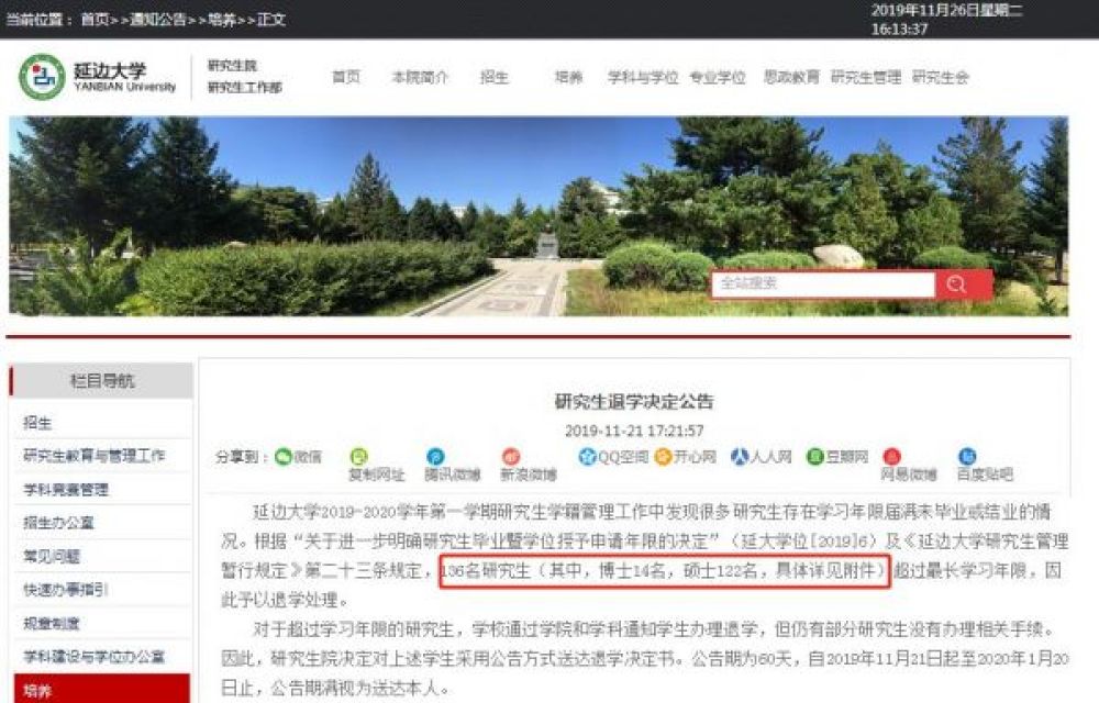 根據“關于進一步明確研究生畢業暨學位授予申請年限的決定”(延大學位[2019]6)及《延邊大學研究生管理暫行規定》第二十三條規定,136名研究生(其中,博士14名,碩士122名,具體詳見附件)超過最長學習年限,因此予以退學處理。工作人員在接受記者電話采訪時表示:“有很多學生都是沒有辦理退學手續,就擅自離校。沒有向學校報備,半道兒就不念了,消失了……這其實是一個歷史遺留問題,我們今年一次性把歷史遺留問題一起處理了,這些問題其實早就該處理了。”