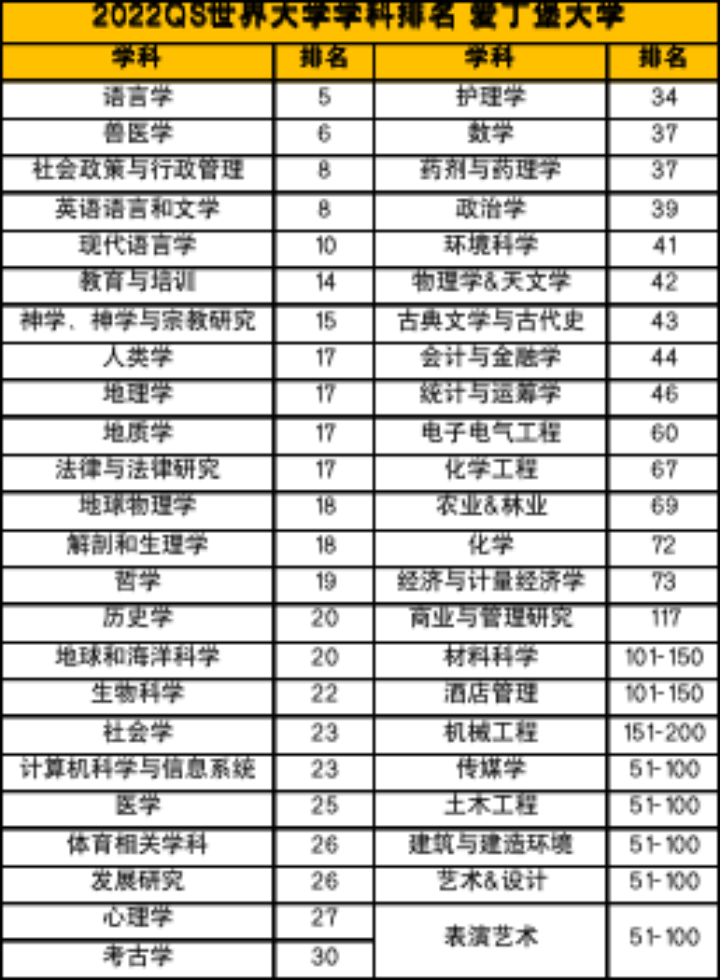 在最新的QS世界大學學科排行榜中,愛丁堡大學的上榜總數為47個,其中: