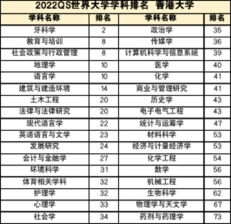 根據2022QS世界大學學科排名發布的數據顯示,港大共有26個專業排名世界前50,其中有8個專業在世界前20,分別是: