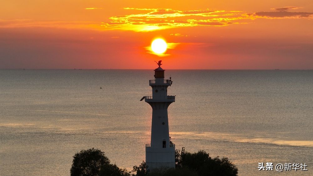 這是9月26日在江蘇省淮安市拍攝的夕陽下的洪澤湖和燈塔(無人機照片)。新華社發(萬震 攝)