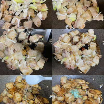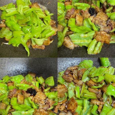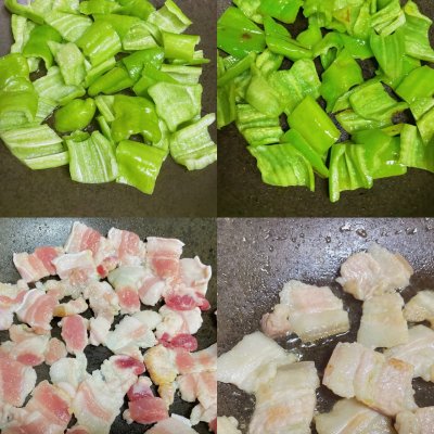 2、鍋中放入底油后放入尖椒塊翻炒至表面稍變虎皮狀盛出,鍋中放入五花肉煸出油脂。