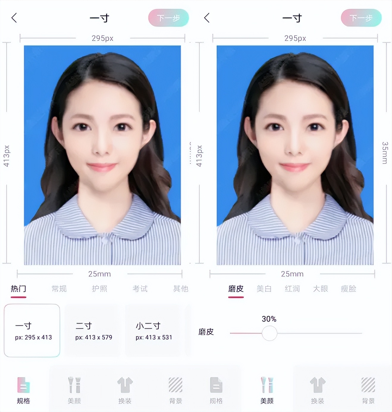 在處理證件照時,還可以AI智能美顏、摳圖換底色、修改尺寸、一鍵自動換裝等功能。