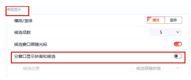 4、下拉界面即可看到“候選顯示”,然后打開“分窗口顯示拼音和候選”后的開關即可。