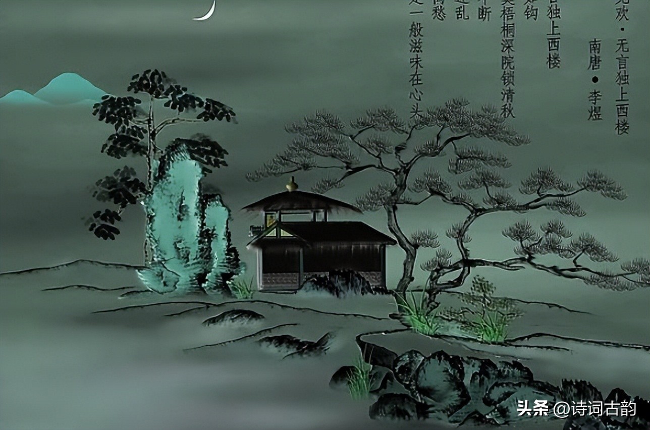&34;無言&34;、&34;獨上&34;是李煜此時孤獨形象的刻畫,&34;無言&34;不是因為無所思而無甚言語,而是滿腹愁苦無從說清,更無人訴說;&34;獨上&34;不是因為尋求靜謊而形單影只,而是身為囚徒無人陪伴,孤苦伶仃;這兩個詞便十分形象地勾畫出了作者此時此刻的孤獨寂寞和凄婉憔悴,而在這樣孤寂的環境下,作者是登上西樓,去遙望故國南唐,這便更增悲苦。