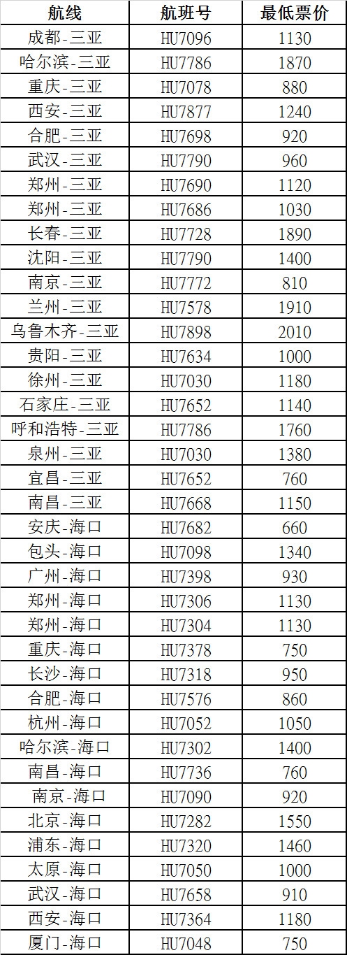 圖:附表1:部分海南進港航班起售票價價格表(注:因航線價格實時變動,請以實際查詢結果為準。)