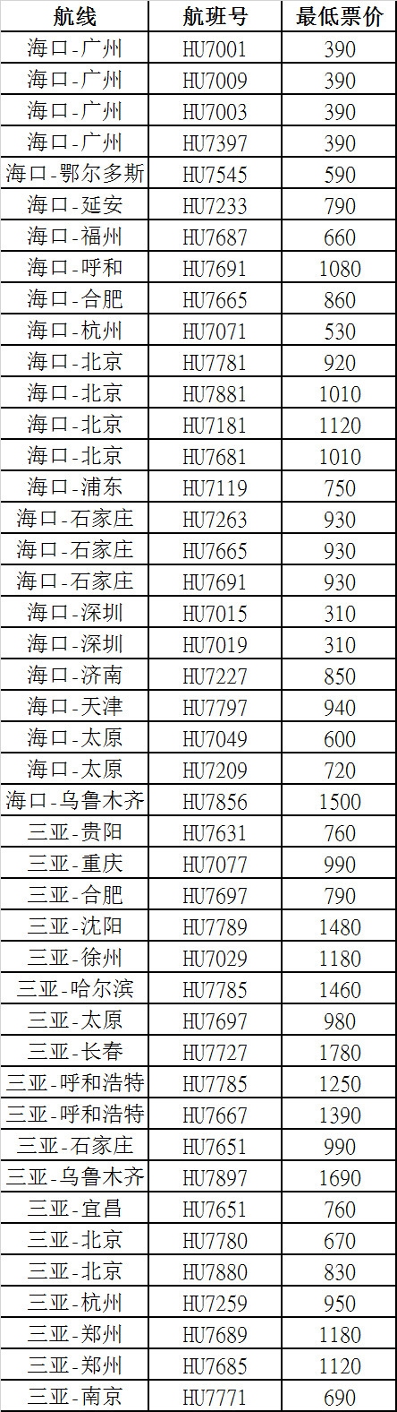 圖:附表2:部分海南出港航班起售票價價格表(注:因航線價格實時變動,請以實際查詢結果為準。)
