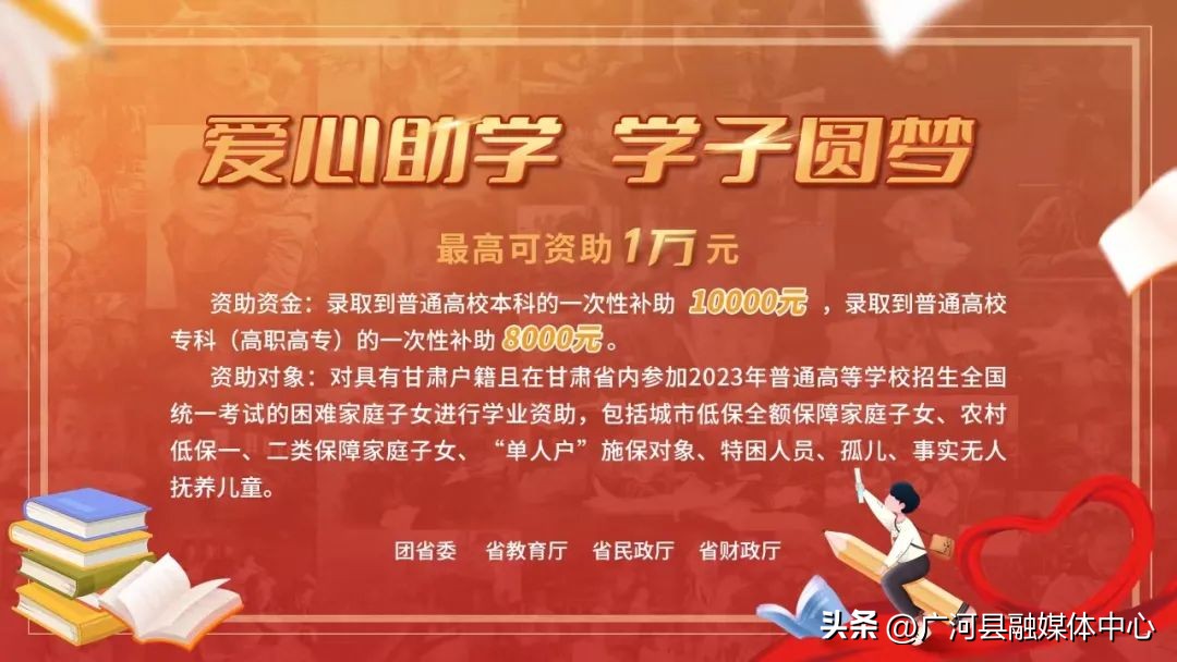 對具有甘肅戶籍且在甘肅省內參加2023年普通高等學校招生全國統一考試,并被錄取到普通高校本科、專科(高職高專)2023級的困難家庭子女進行學業資助(包括:城市低保全額保障家庭子女、農村低保一、二類保障家庭子女、“單人戶”施保對象、特困人員、孤兒、事實無人撫養兒童)。 錄取到普通高校本科的2023級新生一次性補助10000元; 錄取到普通高校專科(高職高專)的2023級新生一次性補助8000元。
