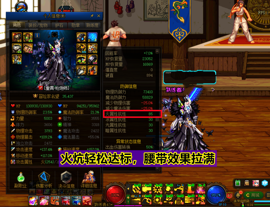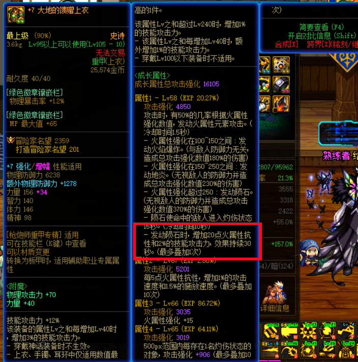大天域的上衣在我們火屬性強化在250以上的時候,攻擊時就有幾率能夠發動隕石,發動隕石之后可以增加20點火炕以及2%技能攻擊力,加上我們原本的85,輕松就能吃滿99火炕增加的45%三速。