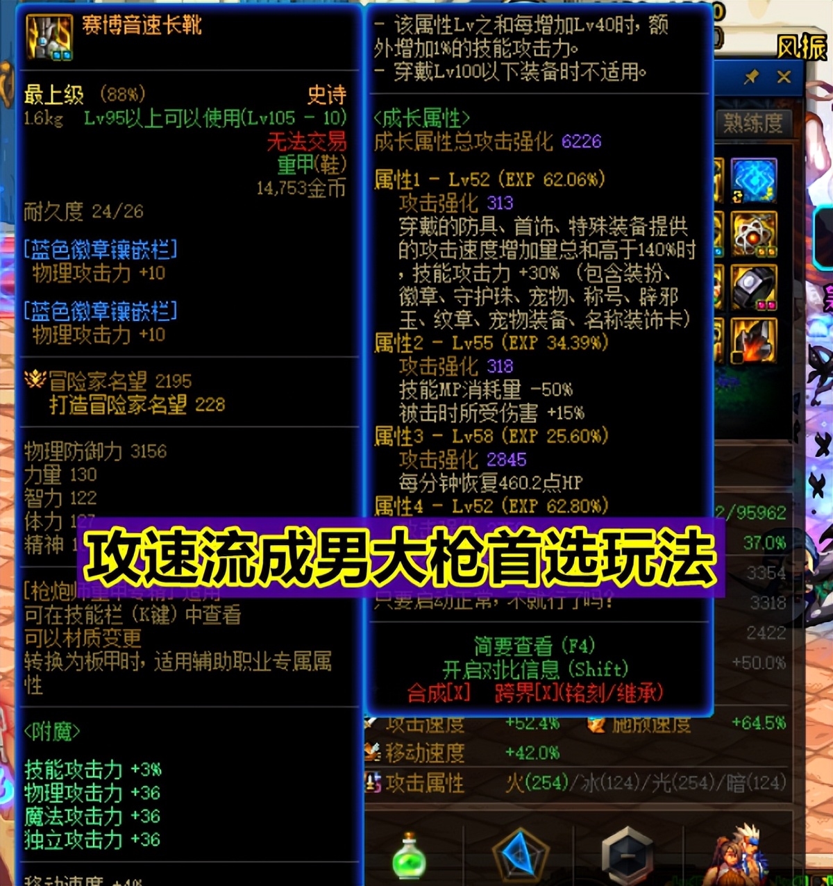 相信這版本玩過男大槍的玩家應該都知道,這可是DNF中爆發傷害數一數二的存在了,狗子我早在之前的活動角色時就練了一個,但由于小號啥也沒有,再加上手感真的不好,所以拿完獎勵就吃灰,直到110版本的出現,攻速鞋直接讓男大槍發生了質變,超高的3速加成,讓之前被我戲稱是“笨比職業”的男大槍,直接成為了我目前除了劍魂之外,最愛玩的一個職業,但對于絕大多數玩家們來說,要想完美觸發攻速鞋,其實并不簡單。