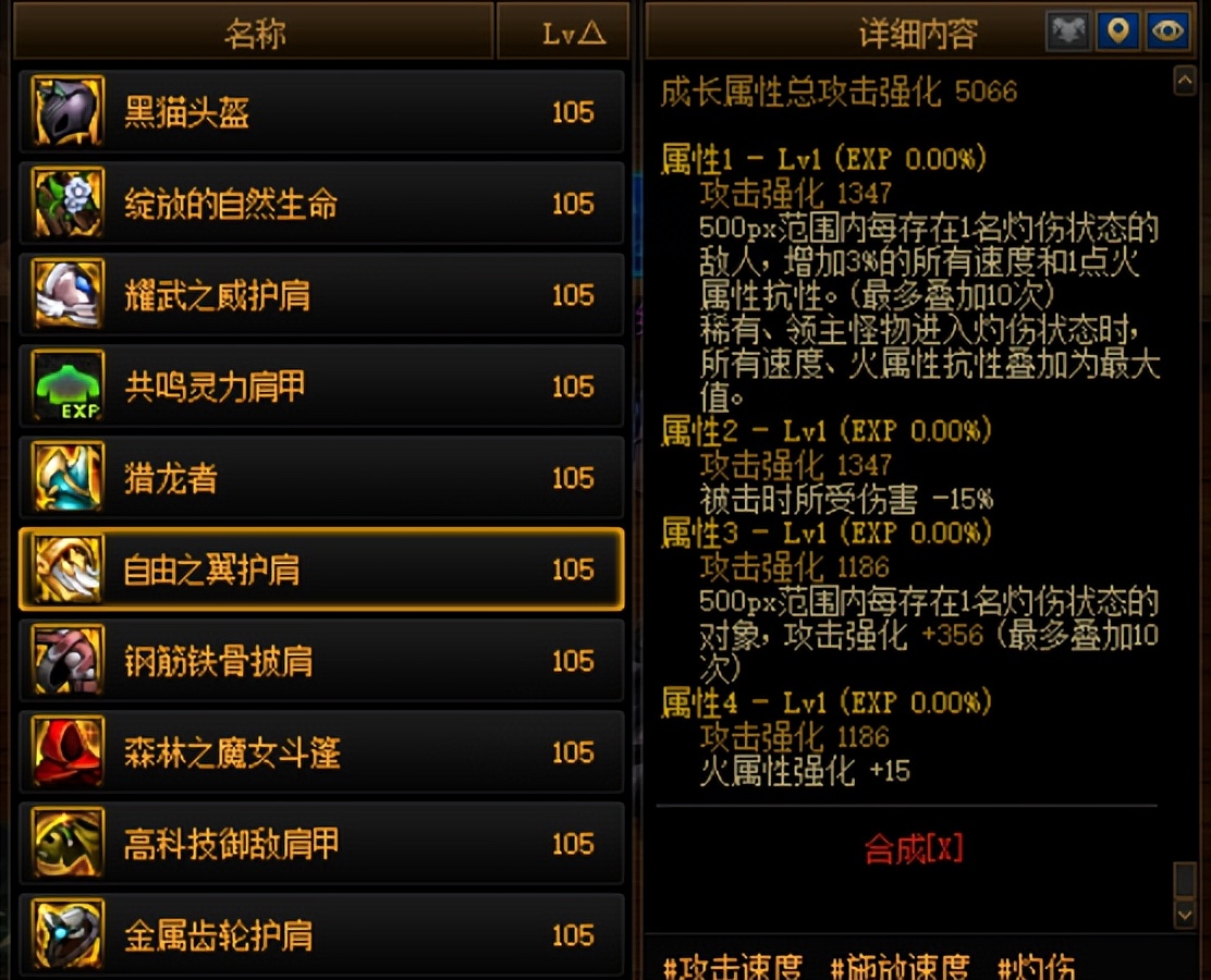 當然,也有可能會有不少平民玩家,平時甚至都不搬磚,也不氪金,那么如果還想要觸發攻速鞋的話,狗子在這里也給大家推薦沒有天空套的2大選擇。其一就是“自由之翼護肩”,這個護肩也需要大家走火強。