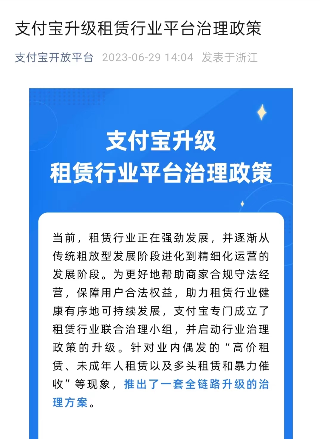 支付寶開放平臺發布公告稱,當前,租賃行業正在強勁發展,并逐漸從傳統粗放型發展階段進化到精細化運營的發展階段。為更好地幫助商家合規守法經營,保障用戶合法權益,助力租賃行健康有序地可持續發展,支付寶專門成立了租賃行業聯合治理小組,并啟動行業治理政策的升級。針對業內偶發的“高價租賃、未成年人租賃以及多頭租賃和暴力催收”等現象,推出了一套全鏈路升級的治理方案。