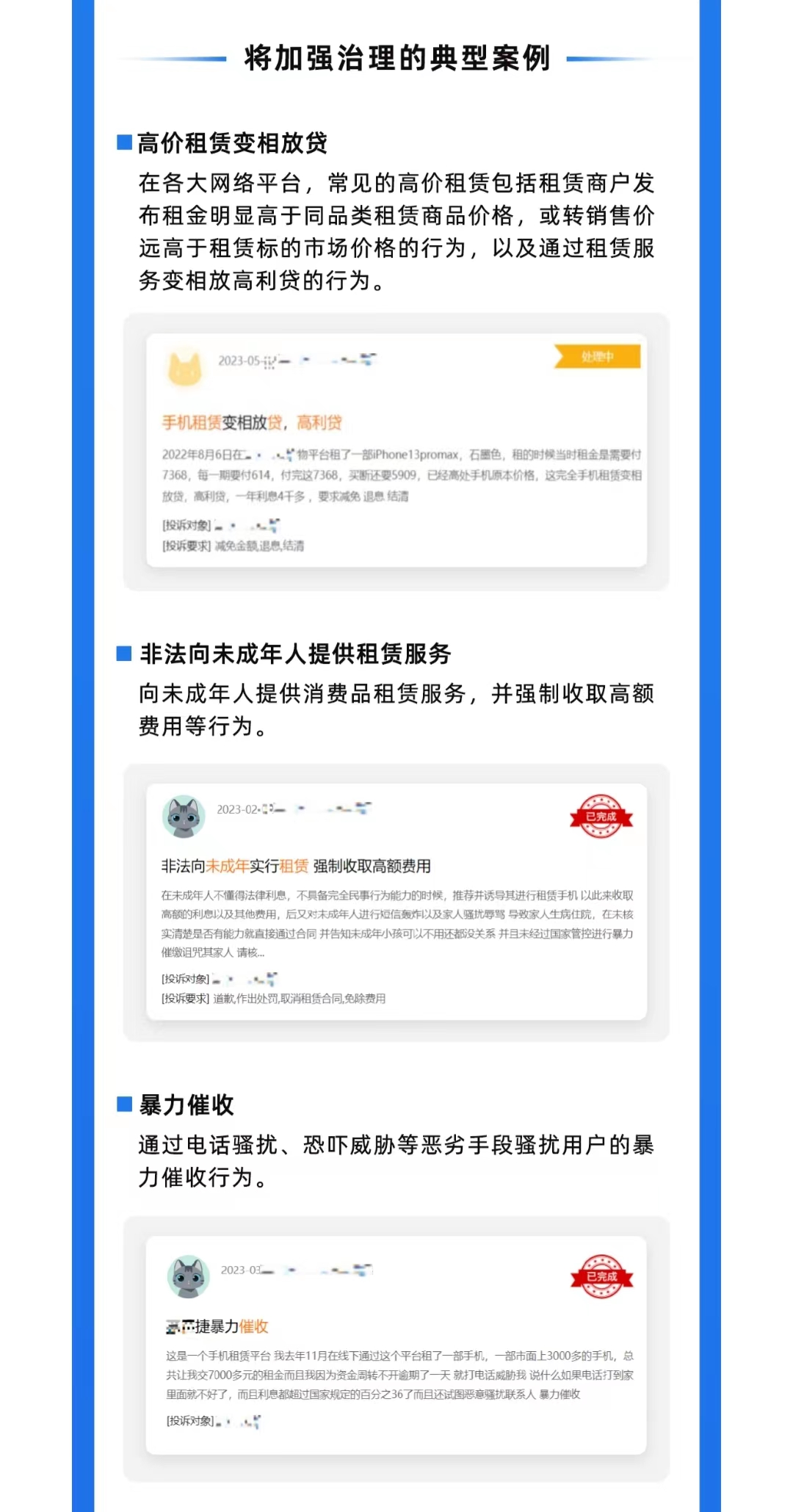 支付寶還宣布將加強治理的典型案例。第一,高價租賃變相放貸:在各大網絡平臺,常見的高價租賃包括租賃商戶發布租金明顯高于同品類租賃商品價格,或轉銷售價遠高于租賃標的市場價格的行為,以及通過租賃服務變相放高利貸的行為。第二,非法向未成年人提供租賃服務:向未成年人提供消費品租賃服務,并強制收取高額費用等行為。第三,暴力催收:通過電話騷擾、恐嚇威脅等惡劣手段騷擾用戶的暴力催收行為。
