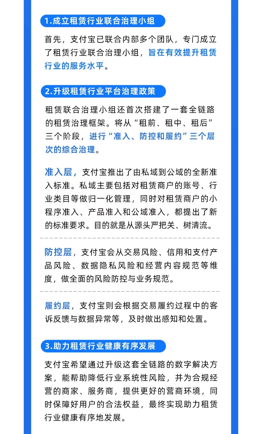 支付寶開放平臺表示,支付寶已聯合內部多個團隊,專門成立了租賃行業聯合治理小組,旨在有效提升租賃行業的服務水平。其次,租賃聯合治理小組還首次搭建了一套全鏈路的租賃治理框架。將從“租前、租中、租后”三個階段,進行“準入、防控和履約”三個層次的綜合治理。最后,支付寶希望通過升級這套全鏈路的數字解決方案,能幫助降低行業系統性風險,并為合規經營的商家、服務商,提供更好的營商環境,同時保障好用戶的合法權益,最終實現助力租賃行業健康有序地發展。