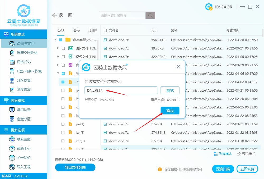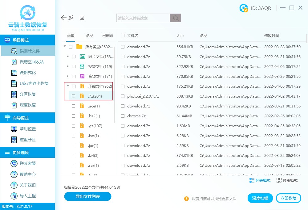 不論是7z文件刪除了,還是其他格式的壓縮文件類型,在清空回收站或者未備份數據的情況下,我們都可以使用云騎士數據恢復軟件,輕松恢復7z文件、RAR文件、zip文件等壓縮文件。但是恢復的前提是新的數據沒有覆蓋舊數據。具體恢復操作如下: