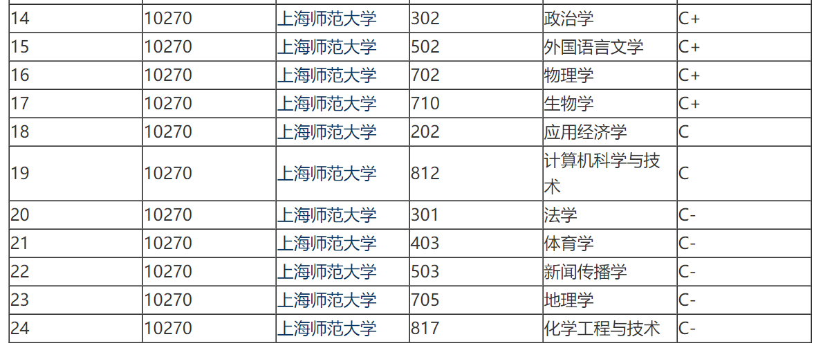 在教育部的第四輪學科評估中,上海師范大學一共有24個參評學科,其中教育學、中國語言文學結果最好,為B+;馬克思主義理論、中國史、數學、哲學等13個學科為B類;政治學、生物學、應用經濟學等11個學科為C類。