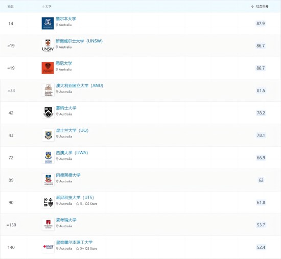 墨爾本大學在本次排名中獲得歷史最高成績,從上次排名的第33名躍升至第14名,超過了澳大利亞國立大學。悉尼大學和新南威爾士大學并列第19名,也同樣創下了新高。
