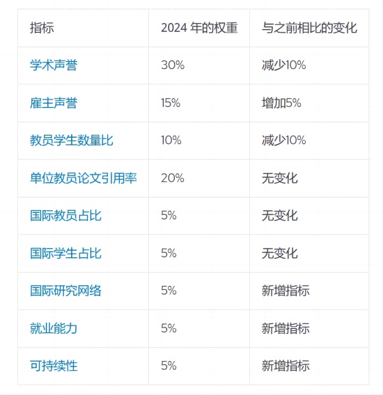 高等教育分析機構QS在過去20年里,每年都對世界大學進行排名。今年,他們對排名方法進行了全方位的調整,新增了國際研究網絡、就業能力和可持續性這三項指標,各占比5%。此外,雇主聲譽的權重也增加了5%,而學術聲譽和教師學生比例的權重則分別減少了10%。