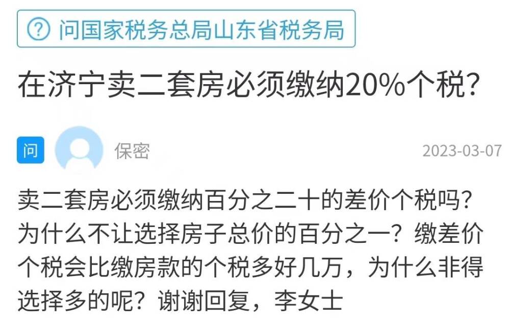 導讀齊魯網·閃電新聞3月28日訊 濟寧的一位網友在《問政山東》網絡問政平臺留言反映賣二套房必須繳納20的差價個稅嗎?為什么不讓選擇房子總價的1?老百姓也就兩個房子,給孩子準備的,繳差價個稅會比繳房款