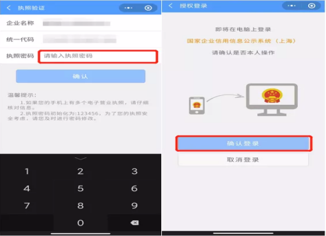 第五步:選擇企業執照后,在執照驗證頁面輸入執照密碼并點擊[確認],手機顯示“授權登錄”頁面,點[確認登錄]即可。