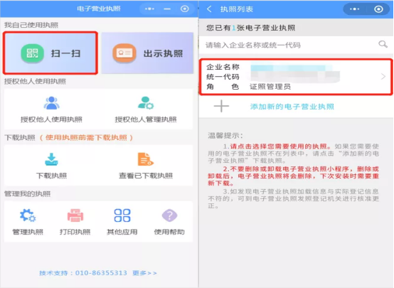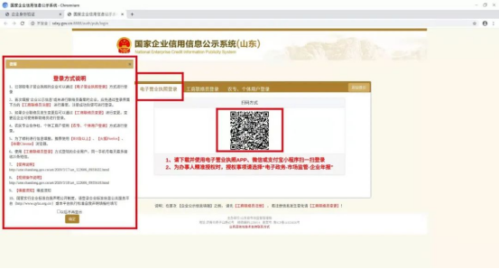 第四步:使用微信、支付寶電子營業執照小程序[掃一掃]功能,掃描頁面中的登錄二維碼,在手機上選擇登錄企業的電子營業執照。