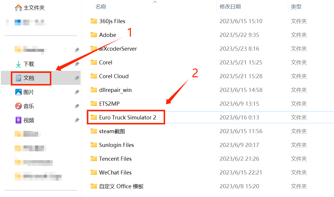 1、打開文檔,找到并打開 Euro Truck Simulator 2 文件夾;