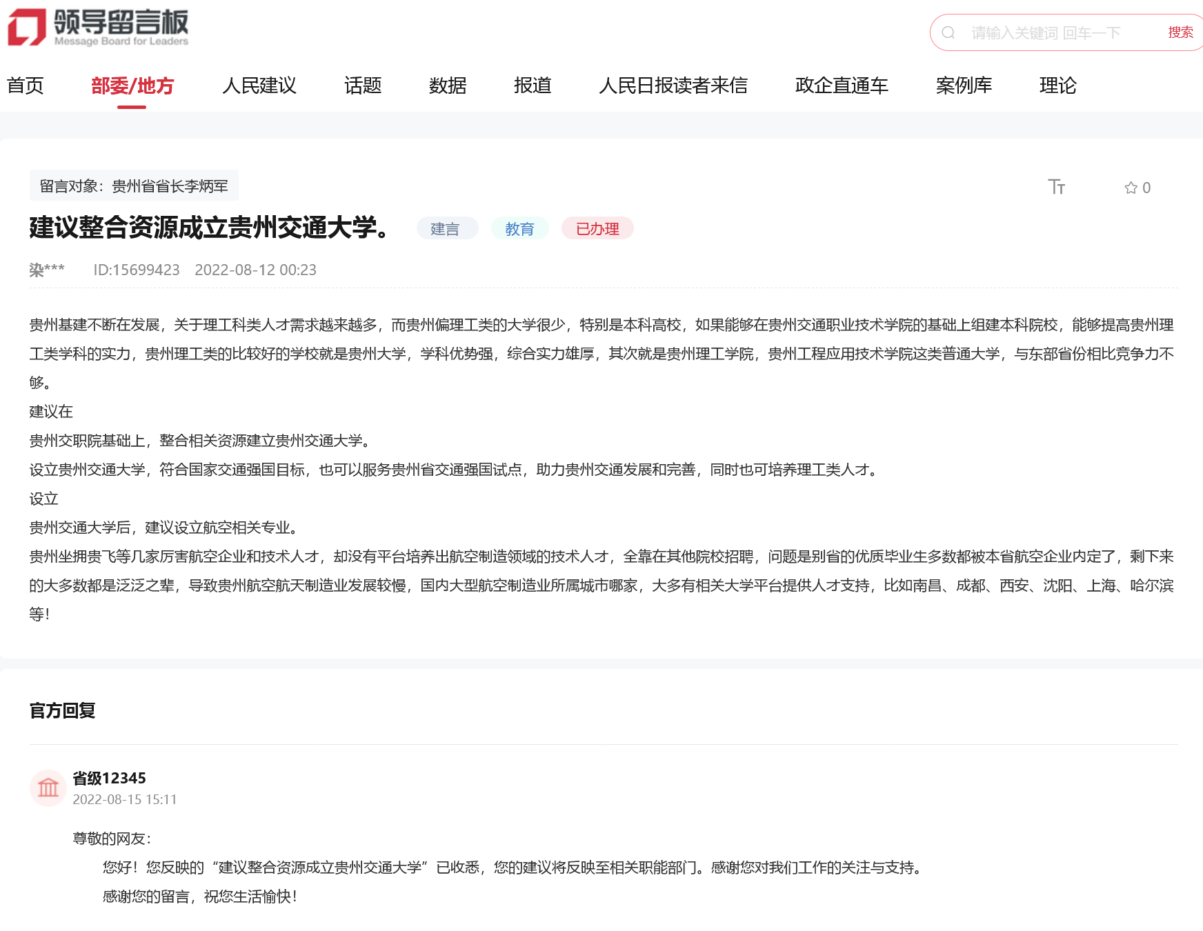 8月15日,貴州省級12345回復:“尊敬的網友: 您好!您反映的“建議整合資源成立貴州交通大學”已收悉,您的建議將反映至相關職能部門。感謝您對我們工作的關注與支持。 感謝您的留言,祝您生活愉快!”
