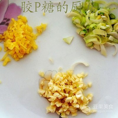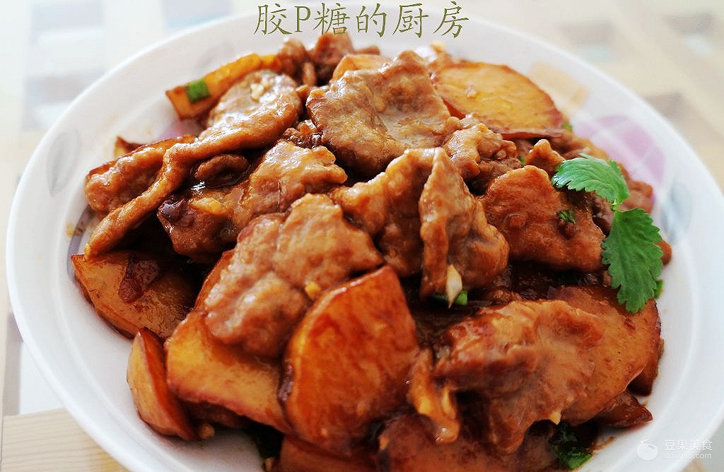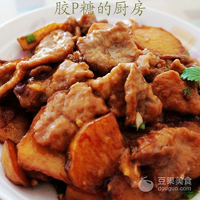 7、重新起鍋,放少許油,將蔥、姜末煸香,倒入過好油的肉和土豆,加少許醬油、醋、鹽,略炒,加入少許高湯或清水(喜歡湯汁多一些的可略多一點),大約中火燉5分鐘,收汁,加蒜末、味素,勾芡,出鍋。