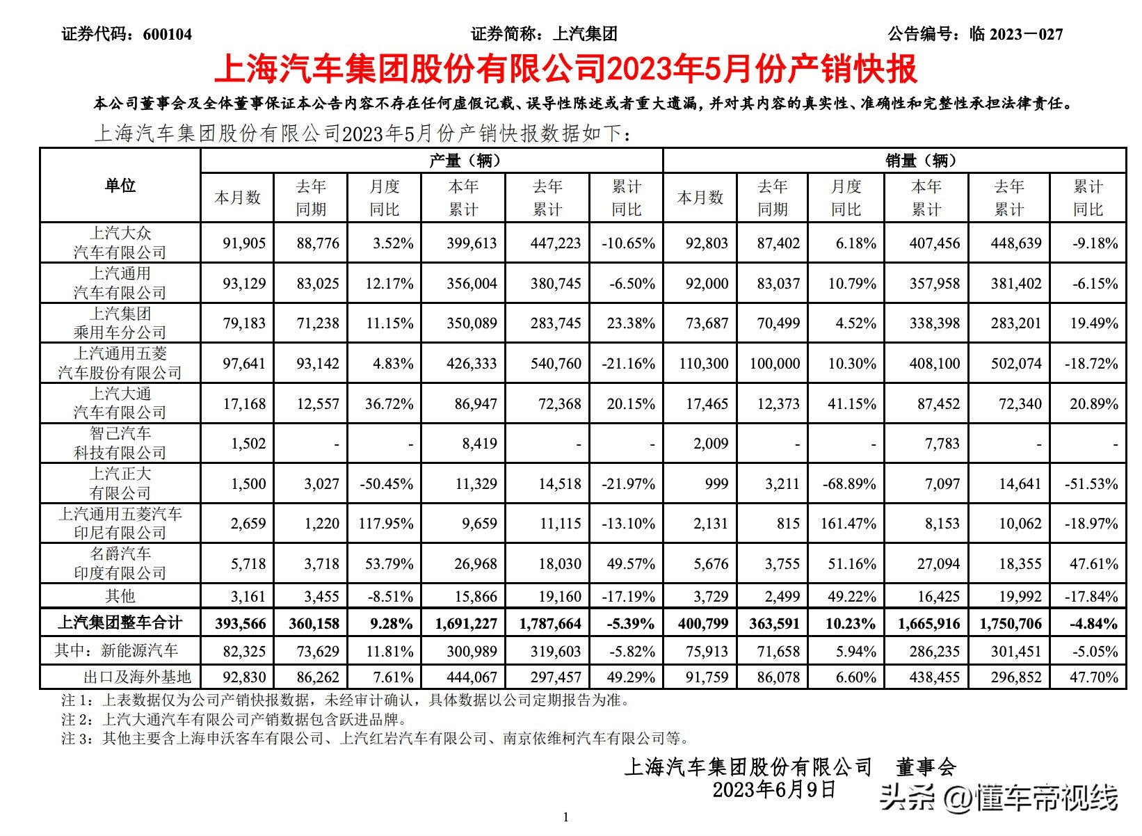 上汽集團公布了2023年5月份公司產銷快報
