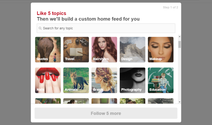 初次登錄Pinterest,網站會提示你自行選擇5個非常感興趣的領域,然后會為你作首圖圖片推薦。
