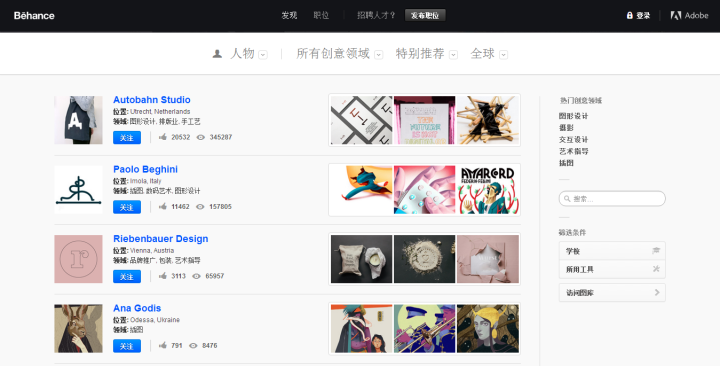 在Behance上還可以關注他人,分享他人的優秀設計作品,和自己喜歡的設計師進行互動。