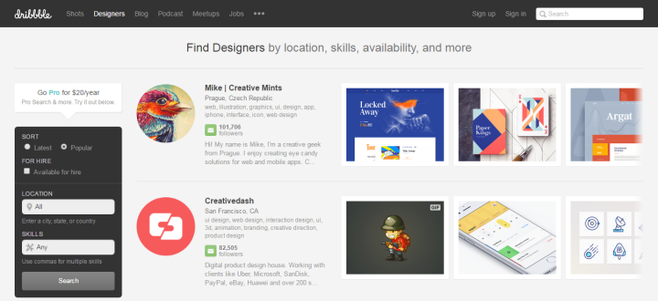 Dribbble鼓勵創作者上傳個人的作品,以及正在創作的作品。用戶可以在線查看已經完成的作品或者正在創作的作品,同時還有機會可以雇傭其中的創作者。