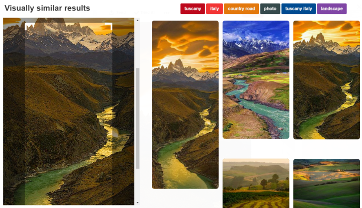 在你選擇好了一張喜歡的圖片之后,點擊圖片右下方的“more”,圖片旁邊就會出現幾張類似的圖片,很酷。另外,選中一張圖片的某一塊區域,系統也會根據相似性分析展示幾張圖片,就像上面這樣。