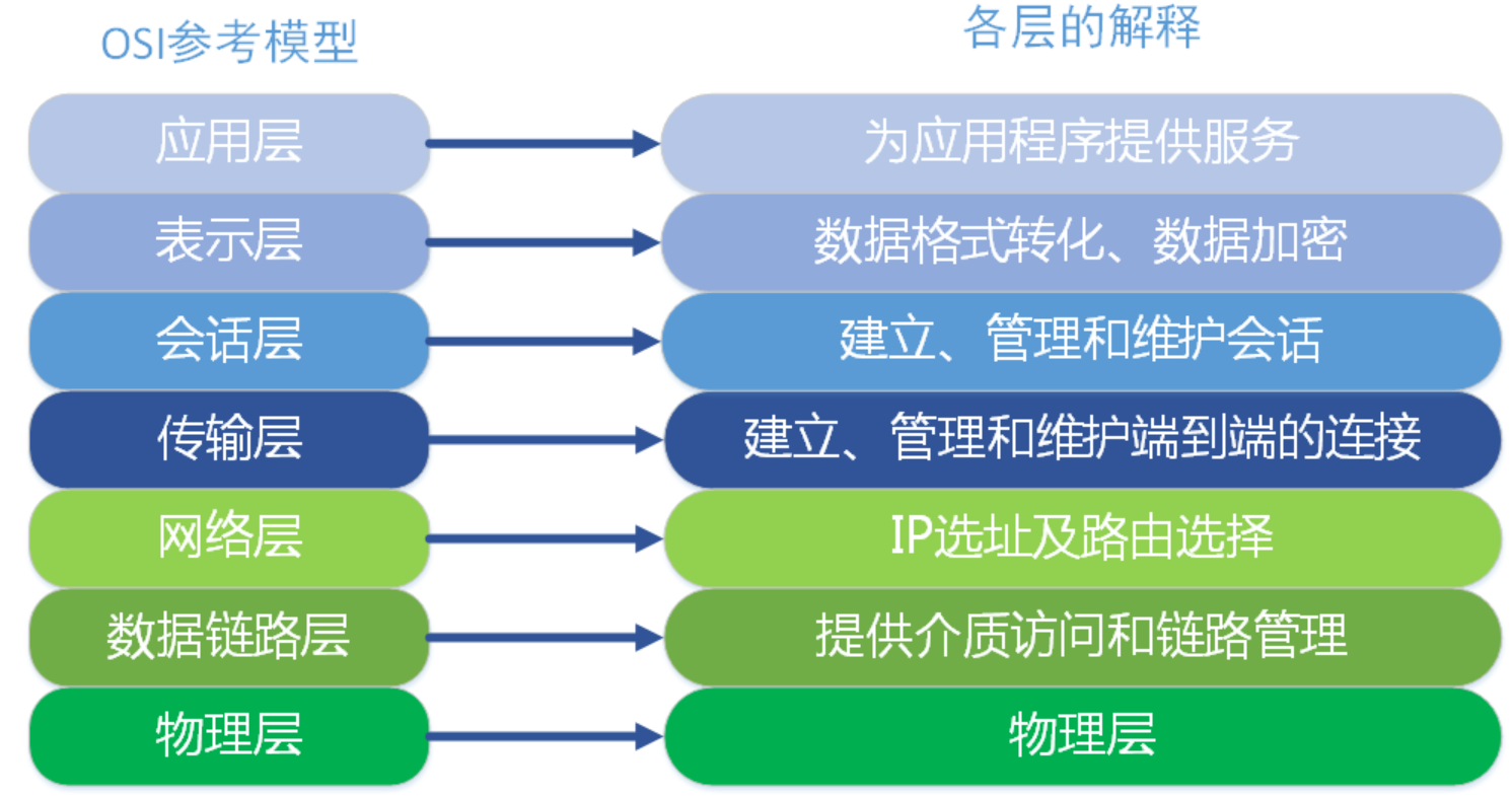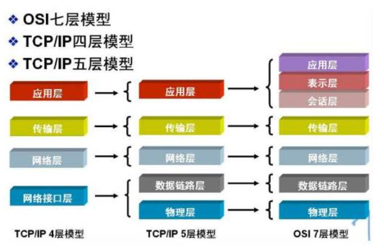 網絡工程師們在剛入門的時候,都會學習到osi七層模型。osi七層模型從下到上分別代表的是,物理層、數據鏈路層、網絡層、傳輸層、會話層、表示層和應用層。osi七層模型與TCP/IP概念層對應圖如下。