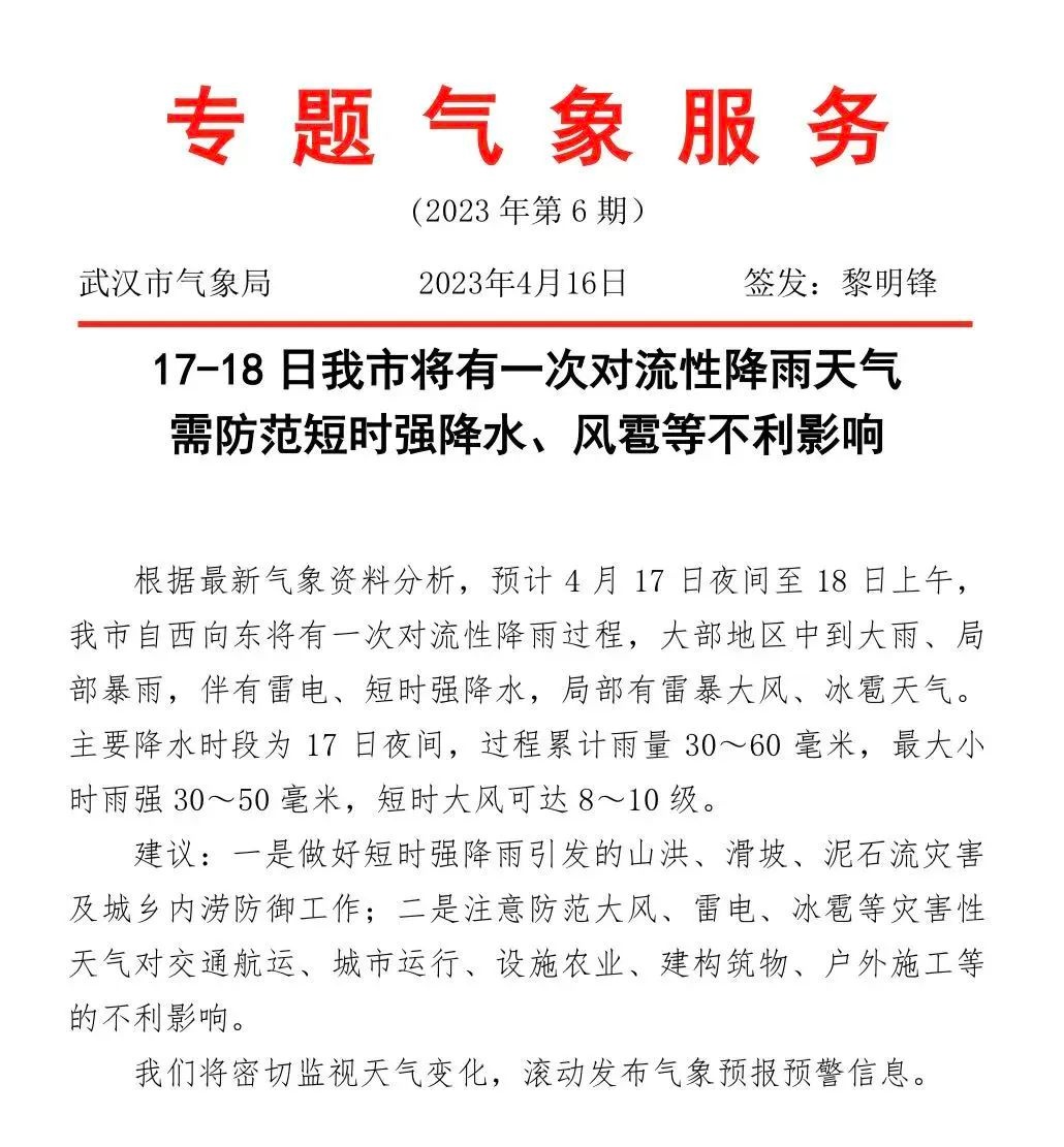 導讀根據武漢市氣象局最新氣象資料分析預計4月17日夜間至18日上午武漢市自西向東將有一次對流性降雨過程大部地區中到大雨、局部暴雨伴有雷電、短時強降水局部有雷暴大風、冰雹天氣主要降水時段為 17 日夜間過程