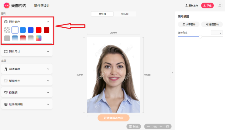 接著我們點擊【照片底色】就可以快速更換背景顏色了,與此同時還能更換尺寸以及補光、美顏等。