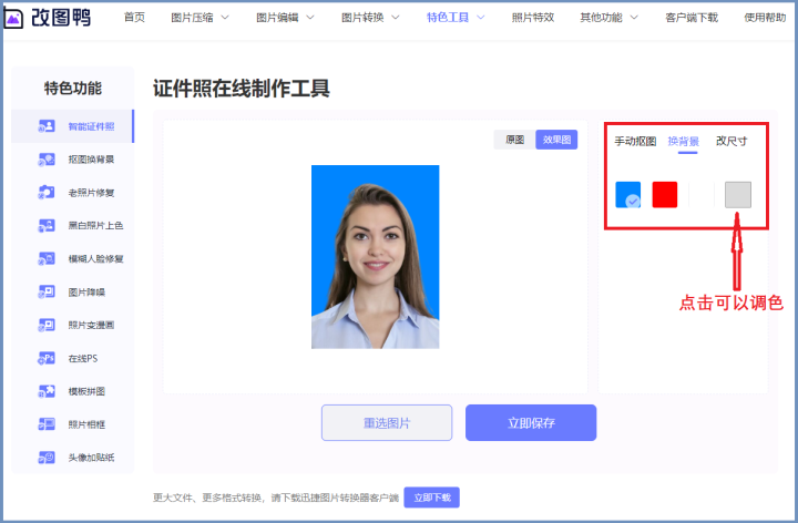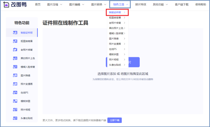 打開網站之后我們點擊【特色功能】就能看到【智能證件照】功能了。