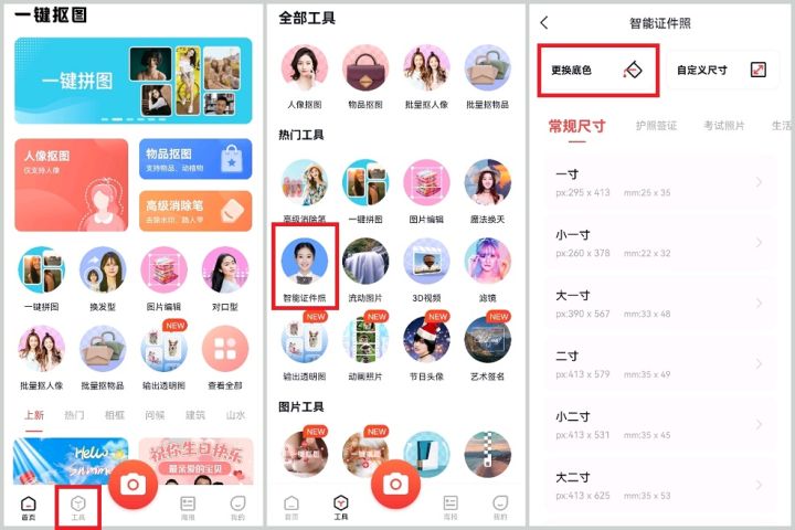 這里就給大家演示一下手機版一鍵摳圖怎么更換證件照底色吧!我們打開軟件之后點擊【工具】點擊【智能證件照】的功能。