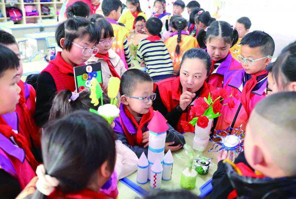 3月2日,市義工聯、益動社工、東寶區泉口街道沿河社區在金象學校開展“學習雷鋒好榜樣”主題活動。志愿者帶領學生觀看雷鋒宣傳片、與學生合唱《學習雷鋒好榜樣》歌曲,學生將廢舊物品制作成精美的手工作品,一起分享制作心得,學習雷鋒艱苦樸素的精神。(記者 張彩云攝)