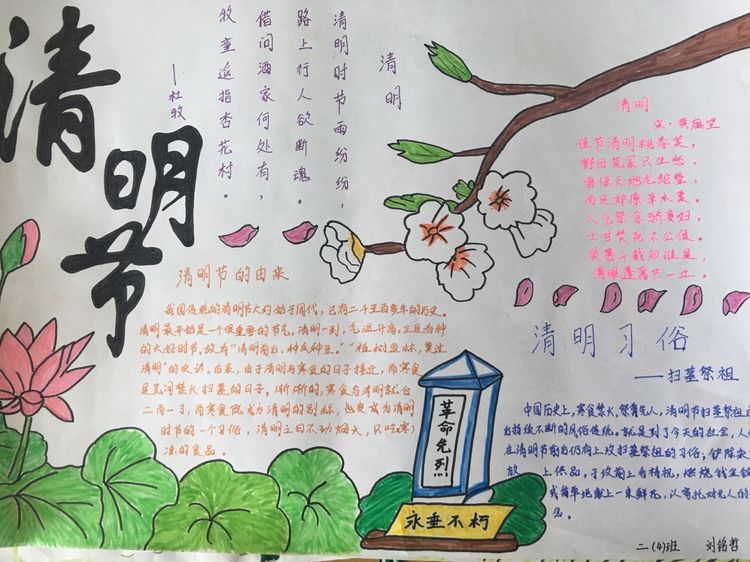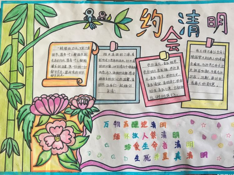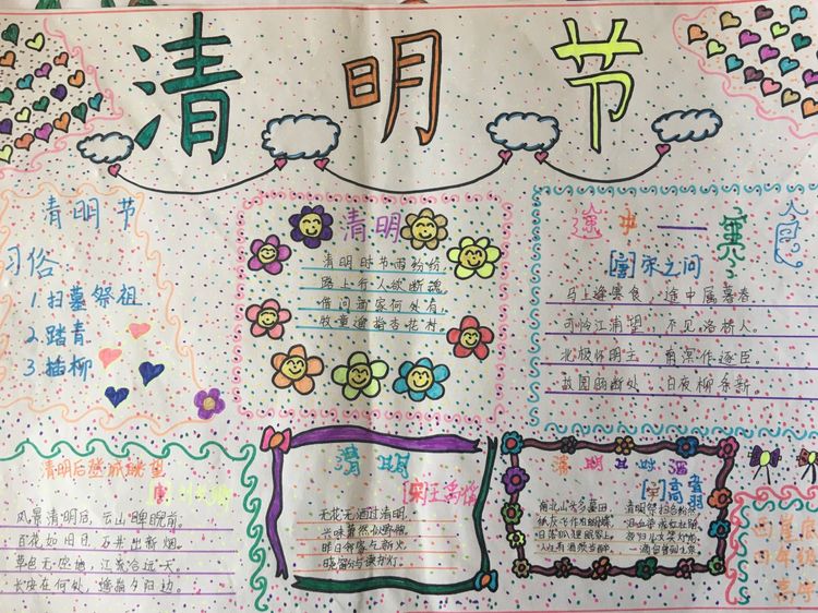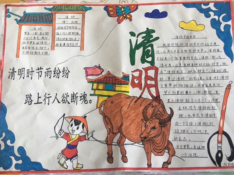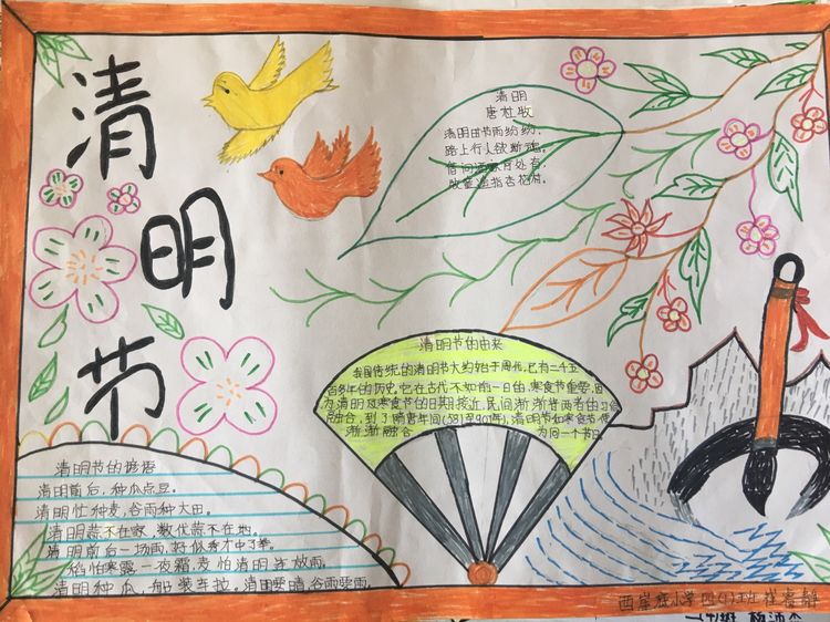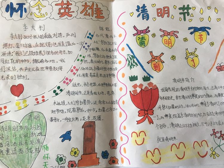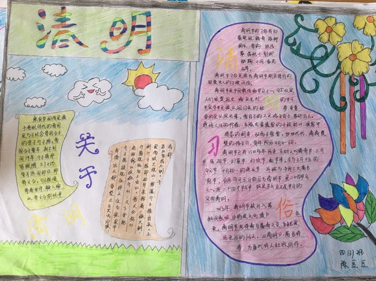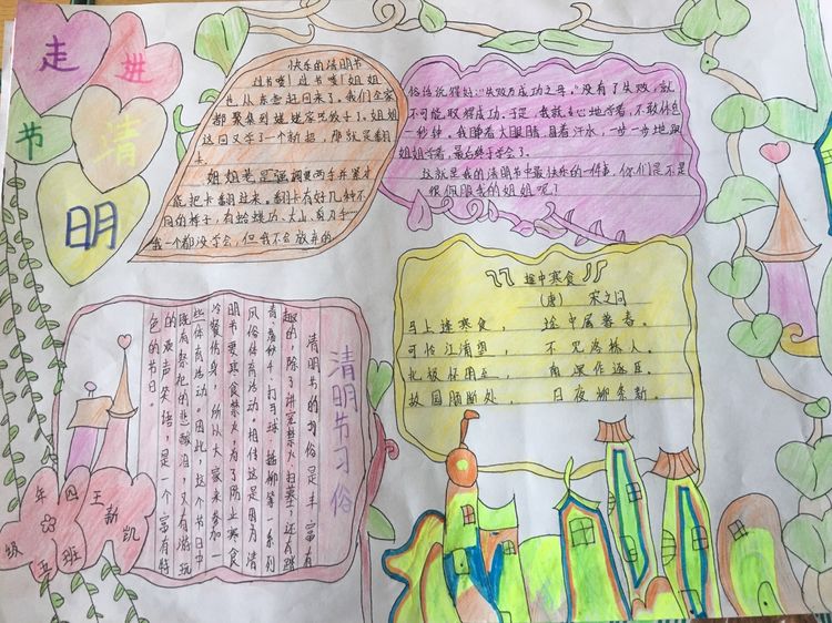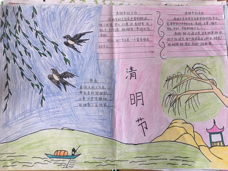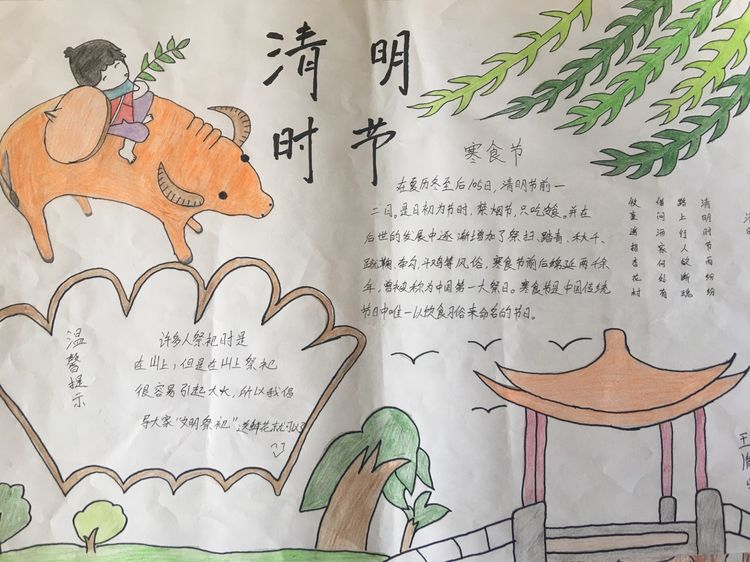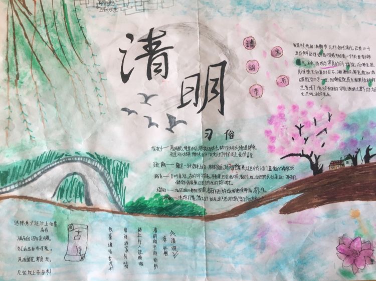 為了讓學生進一步了解傳統文化,激發學生濃厚的民族情懷,促使學生在創作過程中學到更多的傳統文化知識,在清明節假期,該校統一布置清明假期特色作業:學生通過上網、查閱資料,調查寒食、清明的由來及相關習俗古詩,繪制了有關清明節內容的手抄報。