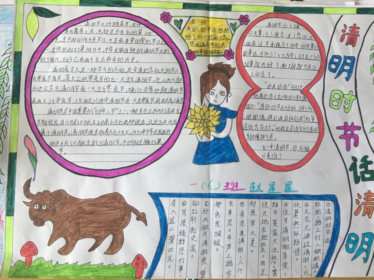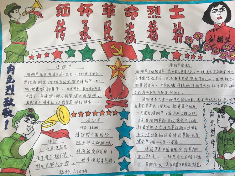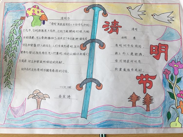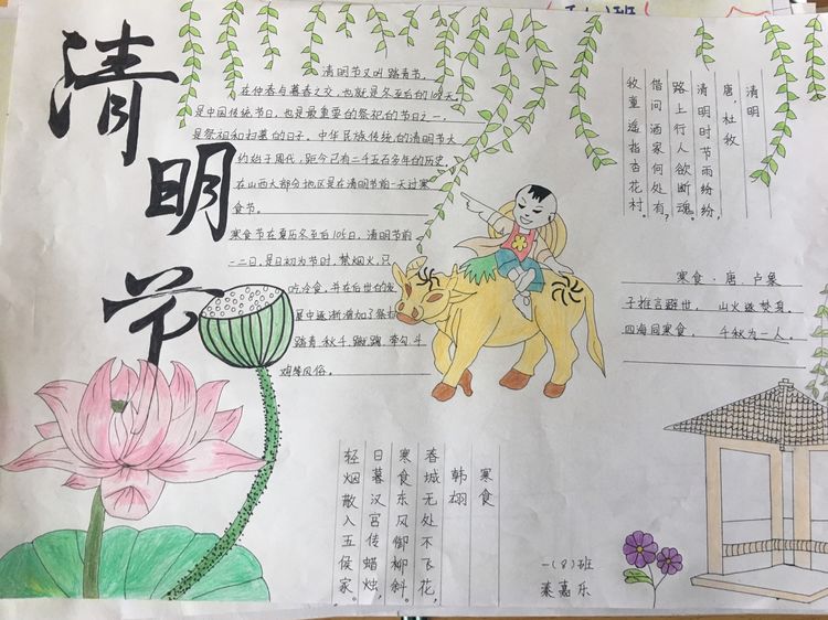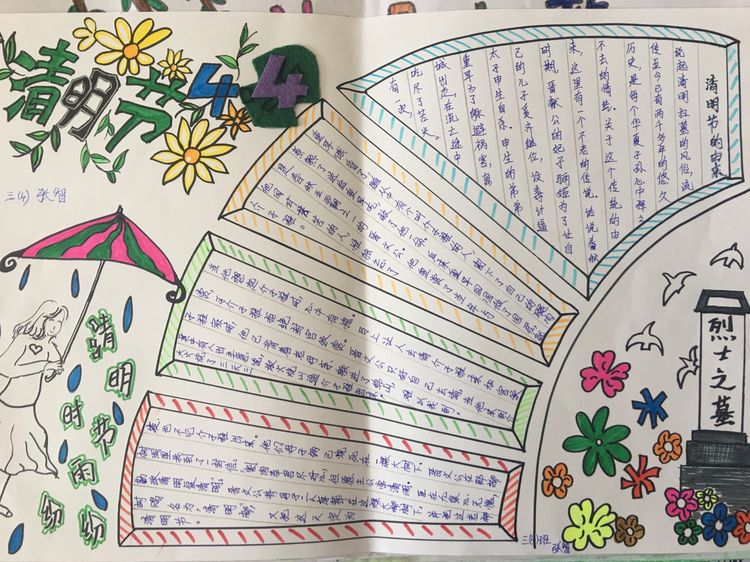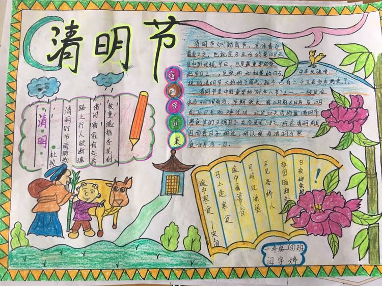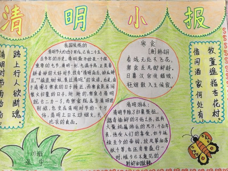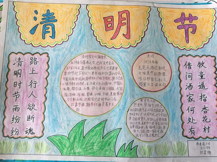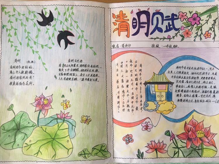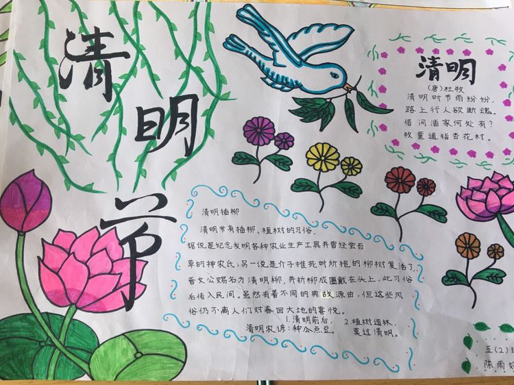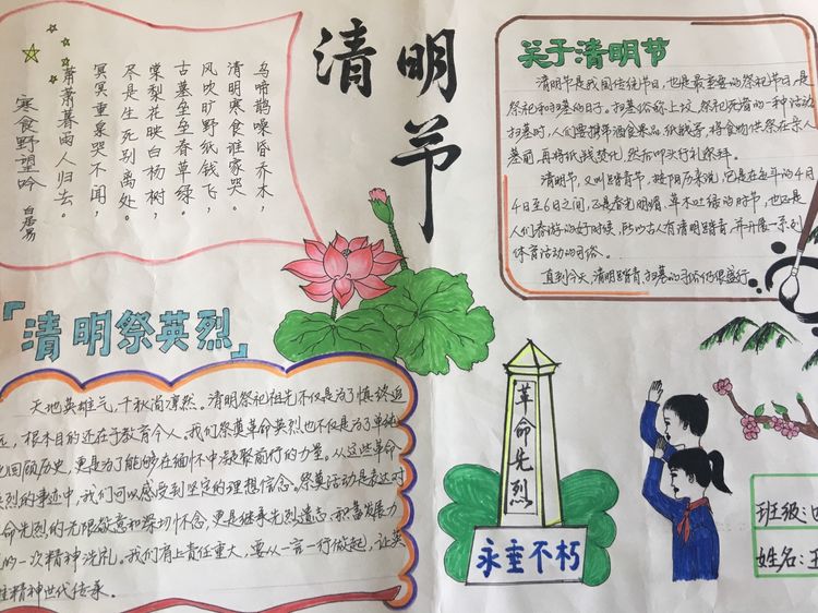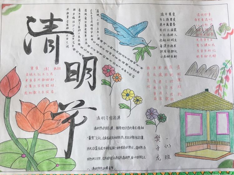 為了讓學生進一步了解傳統文化,激發學生濃厚的民族情懷,促使學生在創作過程中學到更多的傳統文化知識,在清明節假期,該校統一布置清明假期特色作業:學生通過上網、查閱資料,調查寒食、清明的由來及相關習俗古詩,繪制了有關清明節內容的手抄報。