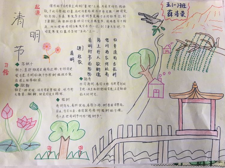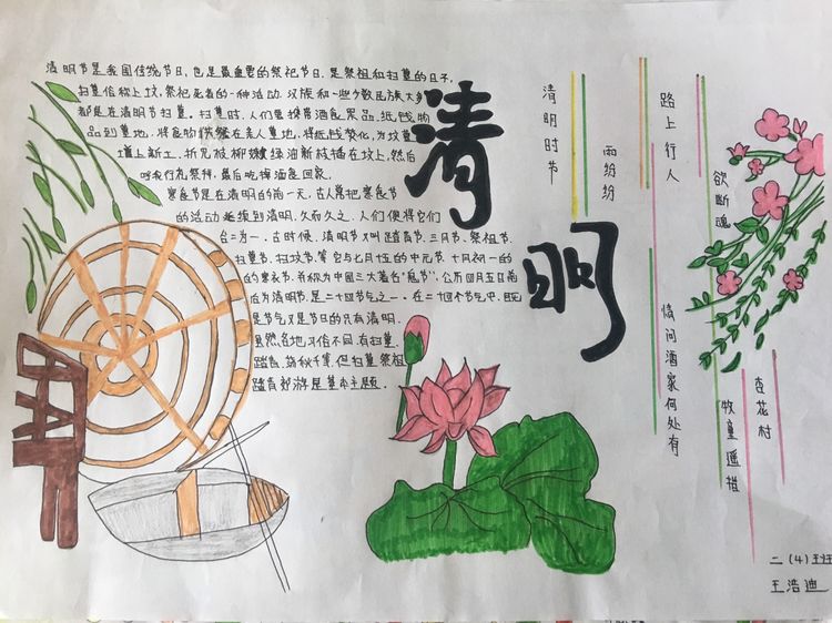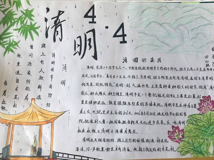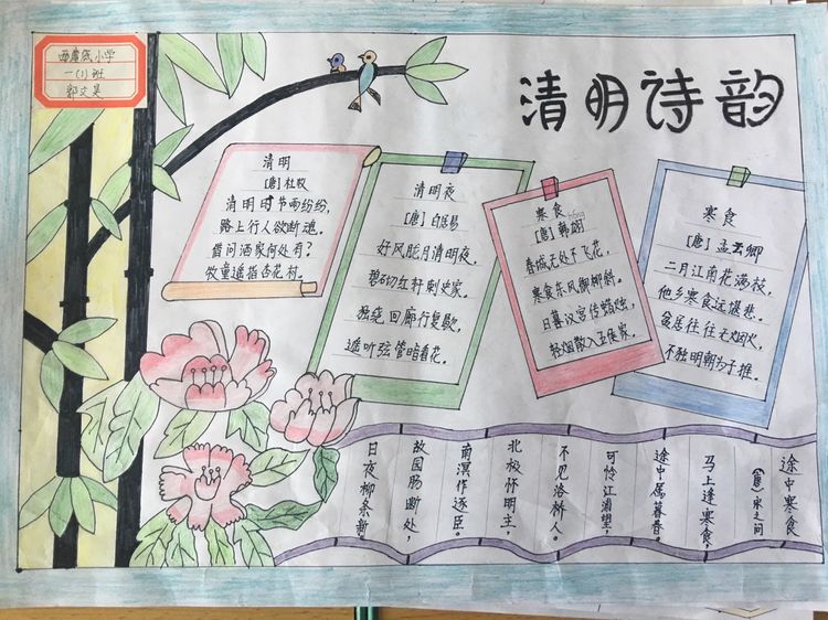 導讀為了讓學生進一步了解傳統文化,激發學生濃厚的民族情懷,促使學生在創作過程中學到更多的傳統文化知識,在清明節假期,該校統一布置清明假期特色作業學生通過上網、查閱資料,調查寒食、清明的由來及相關習俗古詩