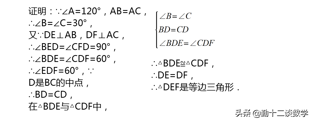 例題2:如圖,在△ABC中,∠A=120°,AB=AC,D是BC的中點,DE⊥AB,DF⊥AC,點E,F為垂足,求證:△DEF是等邊三角形.