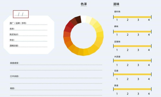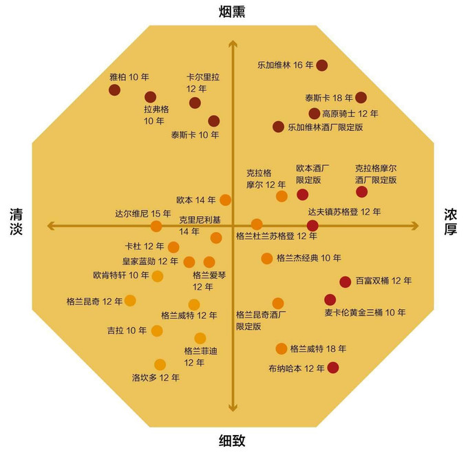 其中,從“清淡”到“濃厚”的橫軸為聞香的評定維度;而從“細致”到“煙熏”的縱軸描述了口感。在這張圖上,你可以簡單標注下酒的香氣和口感,以方便對比。