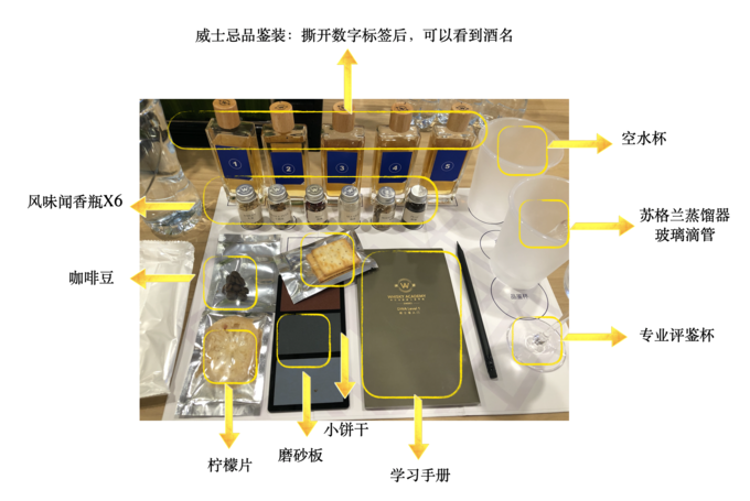 風味聞香瓶:在品酒前可以先聞一聞瓶子里的味道,可以幫你回憶大麥、干陳皮、玫瑰、海鹽、木屑、泥煤各個味道到底是什么樣的。