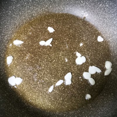 4、炒鍋預熱,放入油,加入蒜片,小火翻炒至爆香。